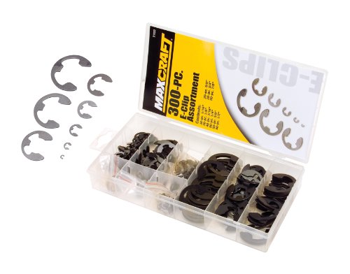Tempered Steel Construction, Durable Black Oxide Finish, Nine Common Sizes. A general-purpose assortment of E-clips. Made by MaxCraft a generous 300 pieces. 30 pieces of 1/16", 30 pieces of 1/8", 40 pieces of 3/16", 50 pieces of 1/4", 50 pieces of 3/8", 40 pieces of 1/2", 20 pieces of 5/8", 20 pieces of 3/4", and 20 pieces of 7/8".